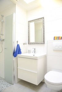 wird durch eine Lichtkuppel erhellt und gelüftet. Es hat eine große Dusche mit ebenerdigem Einstieg, Waschbecken und WC. Ein Fön ist vorhanden. Außerdem steht ein separates WC, indem auch eine Waschmaschine steht, zur Verfügung.