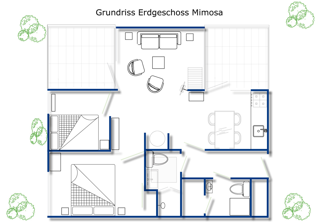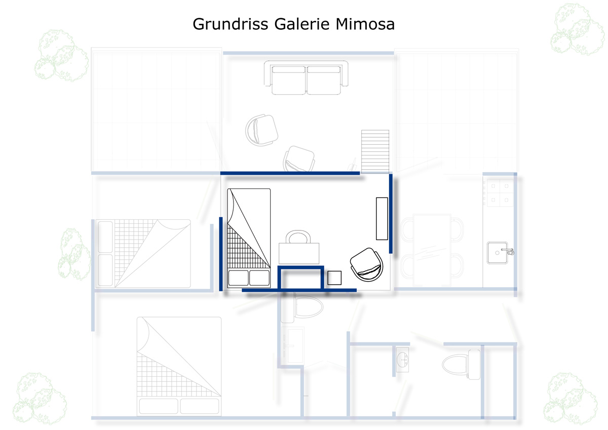 hat einen Zugang zu einer 2. Terrasse und ist durch zwei große Fenster und eine kleine Galerie lichtdurchflutet. Fernseher mit 16 deutschen TV-Programmen, DVD-Player, CD/Radio-Player sowie W-LAN sind vorhanden.
