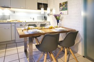 Kühlschrank, Spülmaschine, Mikrowelle, Ceranfeld, Kaffeemaschine, Toaster, Raclettegrill und Wasserkocher. (Backofen und ein 2.  Kühlschrank befinden sich im Blockhaus)